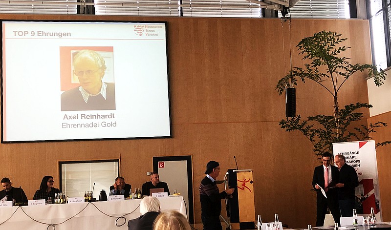 Auf der Mitgliederversammlung des Hessischen Tennisverbandes am 29. Februar 2020 in Frankfurt wurde dem Spielleiter Aktive des Tennisbezirkes Darmstadt Axel Reinhardt die "Goldene Ehrennadel" des Hessischen Tennisverbandes verliehen.